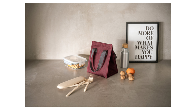 Bolsa térmica em 300D de alta densidade com pegas em webbing. Contém 1 compartimento principal com fecho aderente. Capacidade até 2.5 L. 170 x 220 x 130 mm