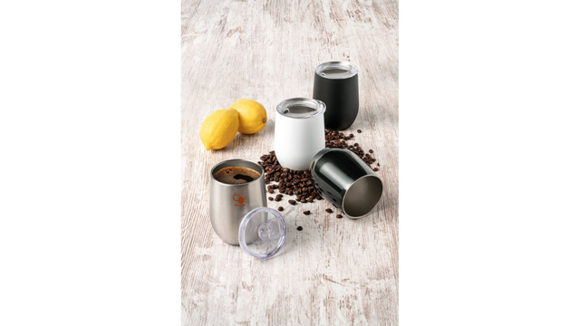 Copo de viagem em aço inox, térmico com parede dupla isolada a vácuo e acabamento mate. Capacidade até 400 mL. Preserva as bebidas quentes por 6h e frias por 8h. Fornecido em caixa presente. Certificação EU Food Grade. ø88 x 112 mm