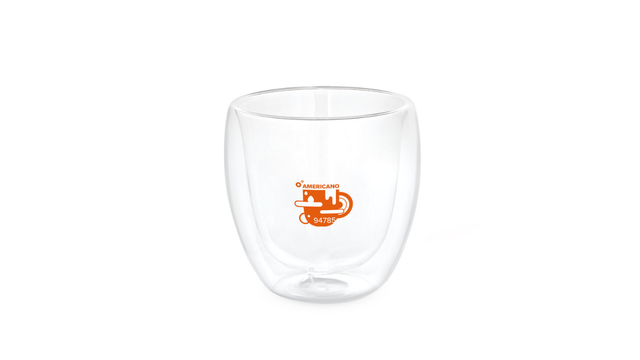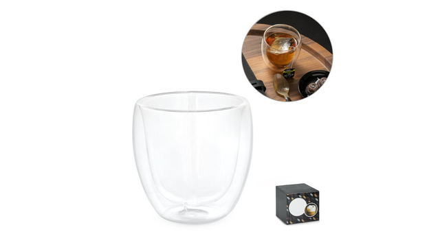 Copo em vidro isotérmico (borossilicato) com parede dupla isolada a ar e capacidade até 220 mL. Fornecido em caixa presente personalizável. Certificação EU Food Grade. ø80 x 86 mm