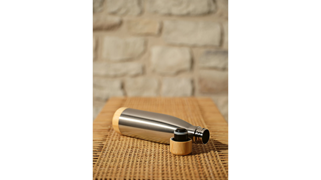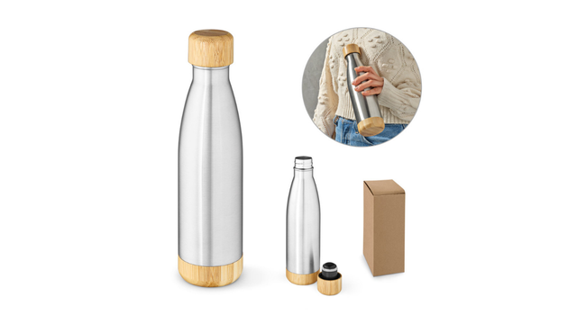 Garrafa em aço inox 90% reciclado de parede dupla térmica, isolada a vácuo. Possui tampa e base em bambu. Capacidade até 550 mL. Fornecido em caixa presente de papel kraft reciclado. Certificação EU Food Grade. A cor e o resultado da impressão nos materiais naturais pode variar entre produtos. ø71 x 272 mm
