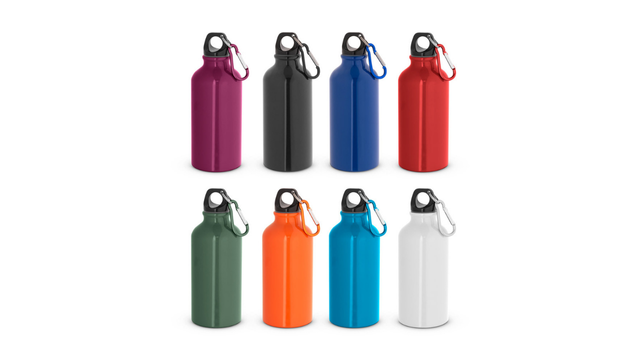 Garrafa esportiva em alumínio e acabamento brilhante com mosquetão 400 mL