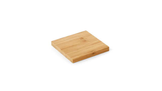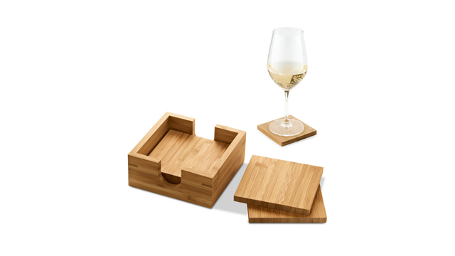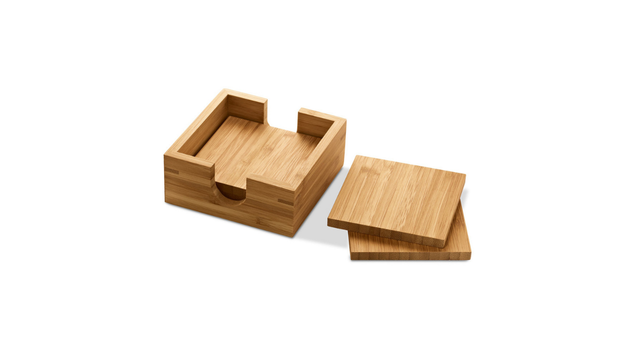 Conjunto de 4 porta copos em bambu com caixa aberta. Fornecido em caixa em papel kraft reciclado. A cor e o resultado da impressão nos materiais naturais pode variar entre produtos. 115 x 115 x 35 mm | Base copo: 100 x 100 x 6 mm | Caixa: 119 x 121 x 56 mm