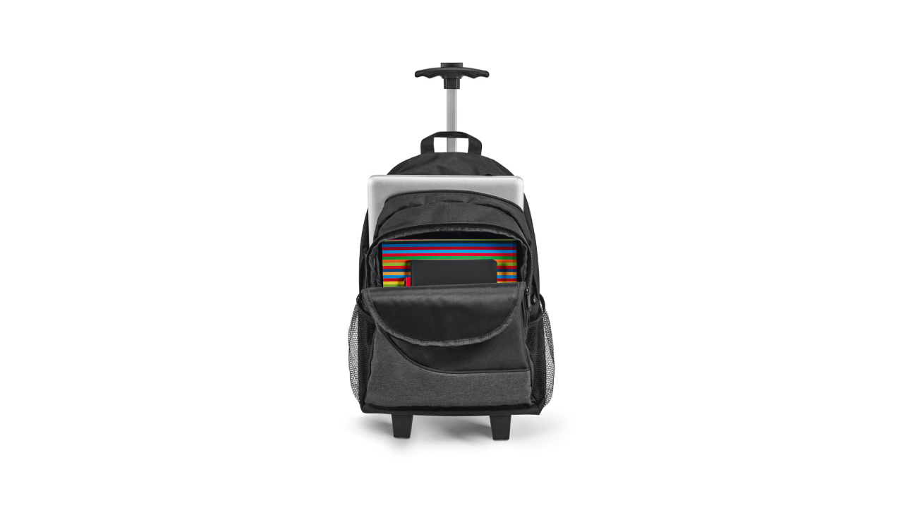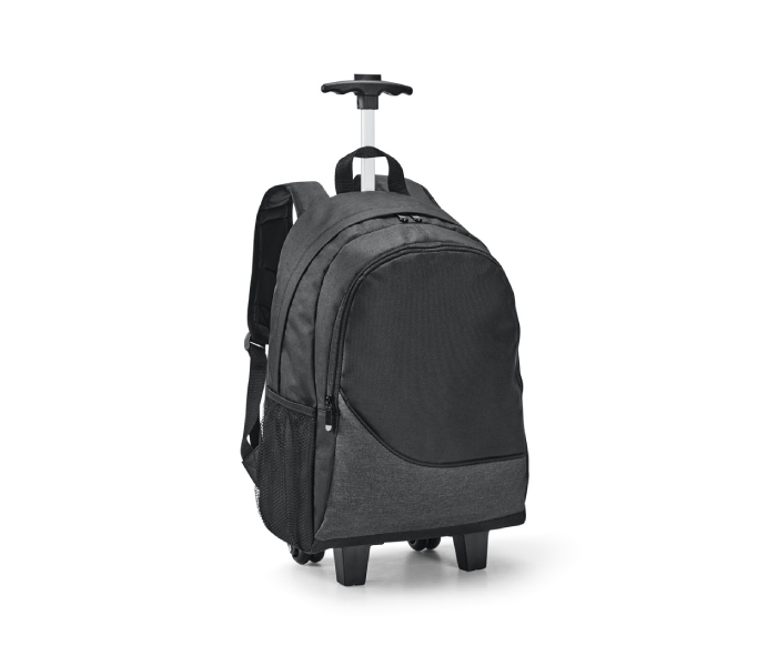 Mochila trolley para notebook em 300D com 2 rodas duplas. Compartimento principal forrado e almofadado com divisória para notebook até 15,6″.