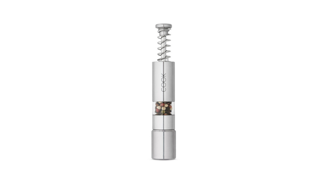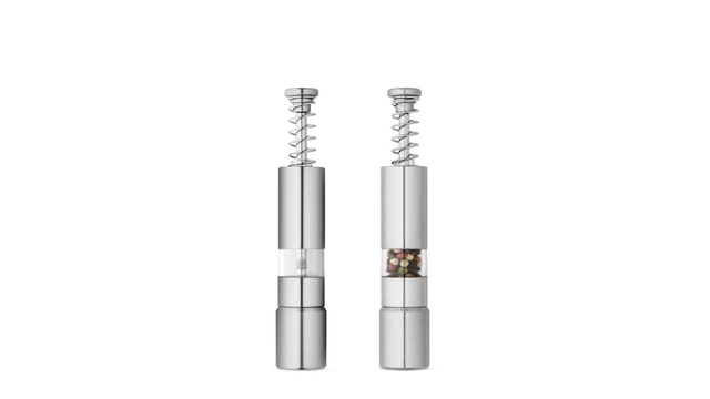 Moinho para especiarias em aço inox. O recipiente em PS, no interior do moinho, permite conservar a especiaria e utilizar conforme necessário. Certificação EU Food Grade. ø27 x 153 mm