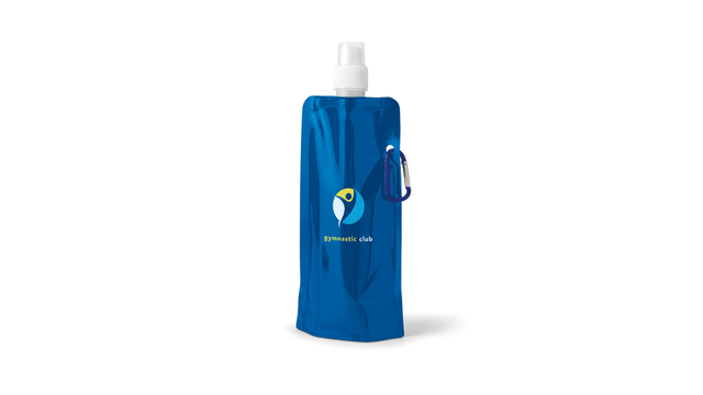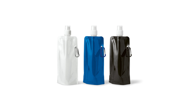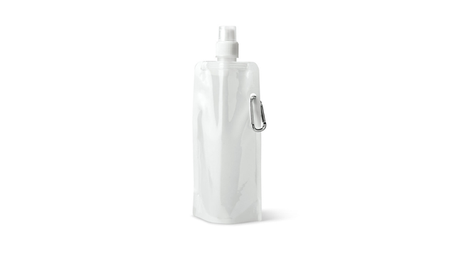 Squeeze dobrável em PE com bico de sistema “push-pull” e acabamento mate. Contém uma tampa transparente e um mosquetão para fácil transporte. Capacidade até 460 mL. Certificação EU Food Grade. 110 x 218 x 64 mm
