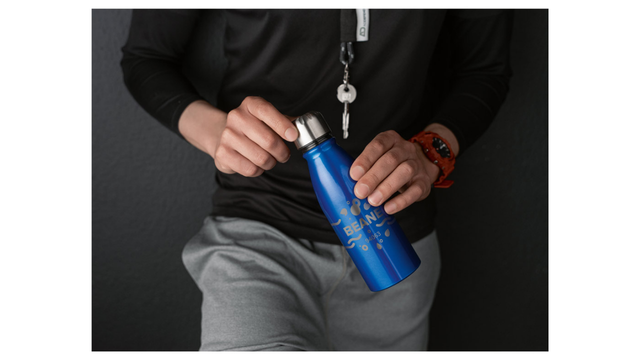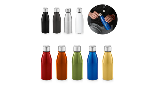 Squeeze em alumínio com tampa em aço inox. Capacidade até 500 mL. Caixa branca 94656 vendida opcionalmente. Certificação EU Food Grade. ø67 x 205 mm