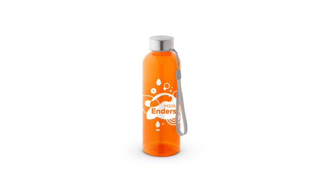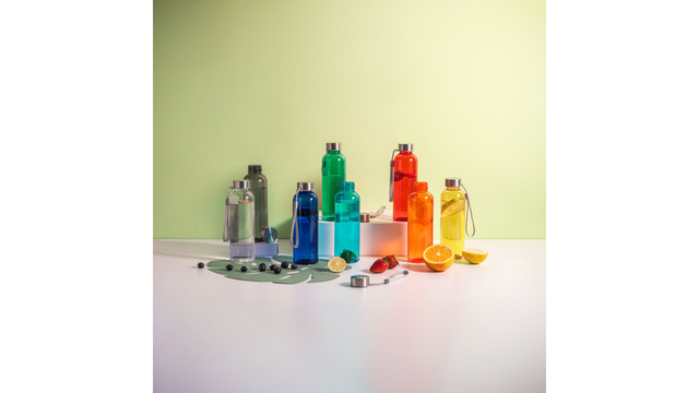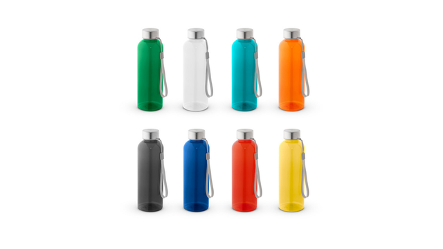 Squeeze em rPET 100% reciclado e tampa em aço inox, com pega em corda para facilitar o transporte. Capacidade até 580 mL. Caixa branca 94656 vendida opcionalmente. Certificação EU Food Grade. ø65 x 210 mm